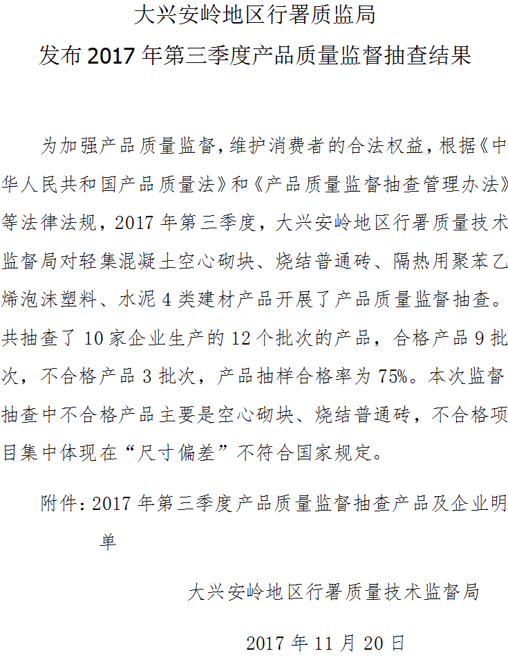 365bet体育在线直播地区行署质监局发布2017年第三季度产品质量监督抽查结果